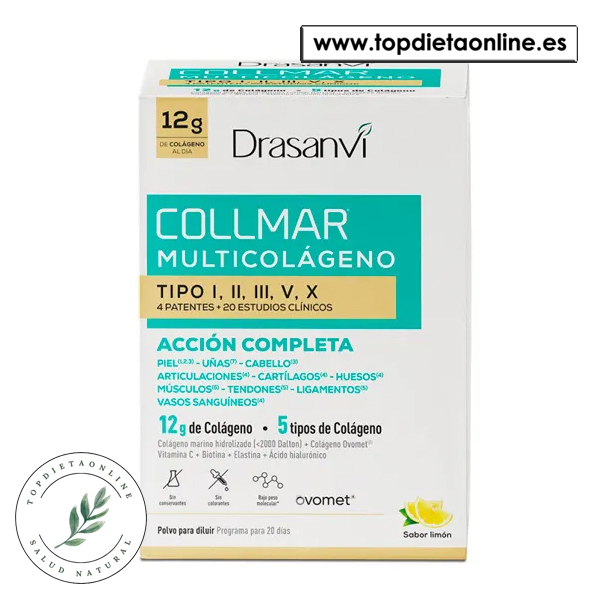 Collmar multicolágeno de Drasanvi, en formato polvo, es un innovador complemento alimenticio antidad que mejora la salud de tu piel, cabello y uñas.